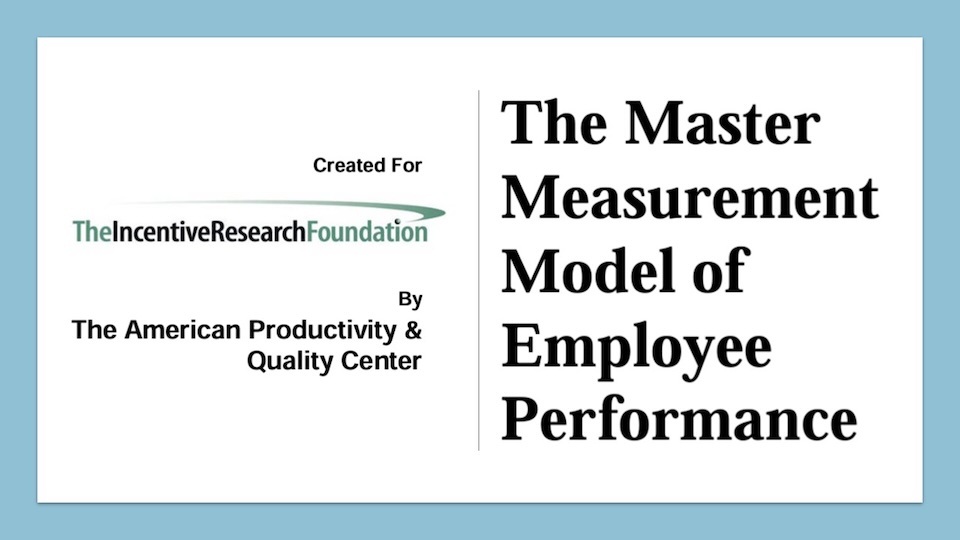 In 2004, the American Productivity and Quality Center created the Master Measurement Model for Employee Performance for the Incentive Research Foundation, explaining how to employ total quality management processes and metrics for the development of any type of sales, non-sales, or channel engagement program. There is no documented evidence of its use by corporations since then, highlighting the lack of measurement of most IRR programs, even though these processes are used at probably over 1 million enterprises around the world in manufacturing, engineering, and related processes.